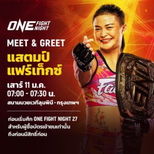 โดยผู้ที่มีสิทธิ์เข้าร่วมกิจกรรมครั้งนี้ต้องซื้อบัตรเข้าชมศึก ONE Fight Night 27 แล้วเท่านั้น ซึ่งภายในงานนอกจากจะได้พบปะพูดคุยกับนักชกคนดังอย่างใกล้ชิดแล้ว ยังจะได้รับโปสเตอร์พร้อมลายเซ็นจากมือ “แสตมป์ แฟร์เท็กซ์” กลับบ้านอีกด้วย แต่งานนี้ใครมาถึงก่อนมีสิทธิ์ก่อน เพราะของที่ระลึกสุดพิเศษนี้มีจำนวนจำกัด