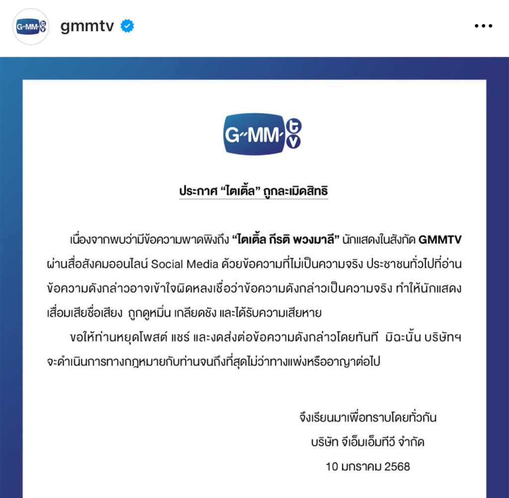 โดยทางต้นสังกัด “GMM TV” ได้ร้อนจดหมายประกาศว่า “ประกาศ “ไตเติ้ล” ถูกละเมิดสิทธิ เนื่องจากพบว่ามีข้อความพาดพิงถึง “ไตเติ้ล กีรติ พวงมาลี” นักแสดงในสังกัด GMMTVผ่านสื่อสังคมออนไลน์ Social Media ด้วยข้อความที่ไม่เป็นความจริง ประชาชนทั่วไปที่อ่าน ข้อความดังกล่าวอาจเข้าใจผิดหลงเชื่อว่าข้อความดังกล่าวเป็นความจริง ทำให้นักแสดง