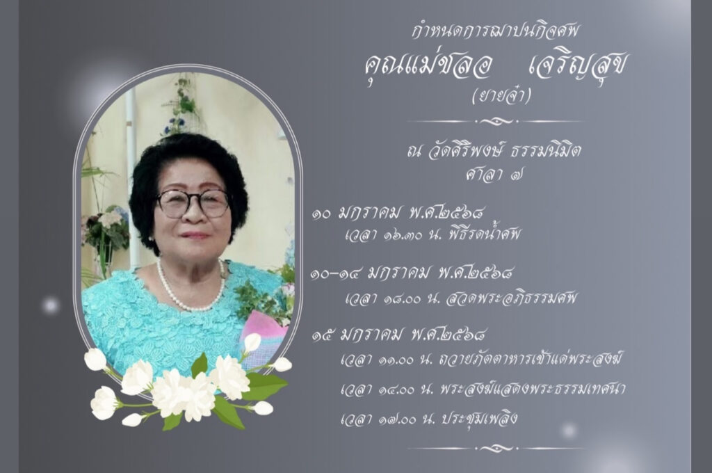 กำหนดการฌาปนกิจศพ คุณแม่ชลอ เจริญสุข(ยายจ๋า) ณ วัดศีริพงษ์ ธรรมนิมิตศาลา ๗
