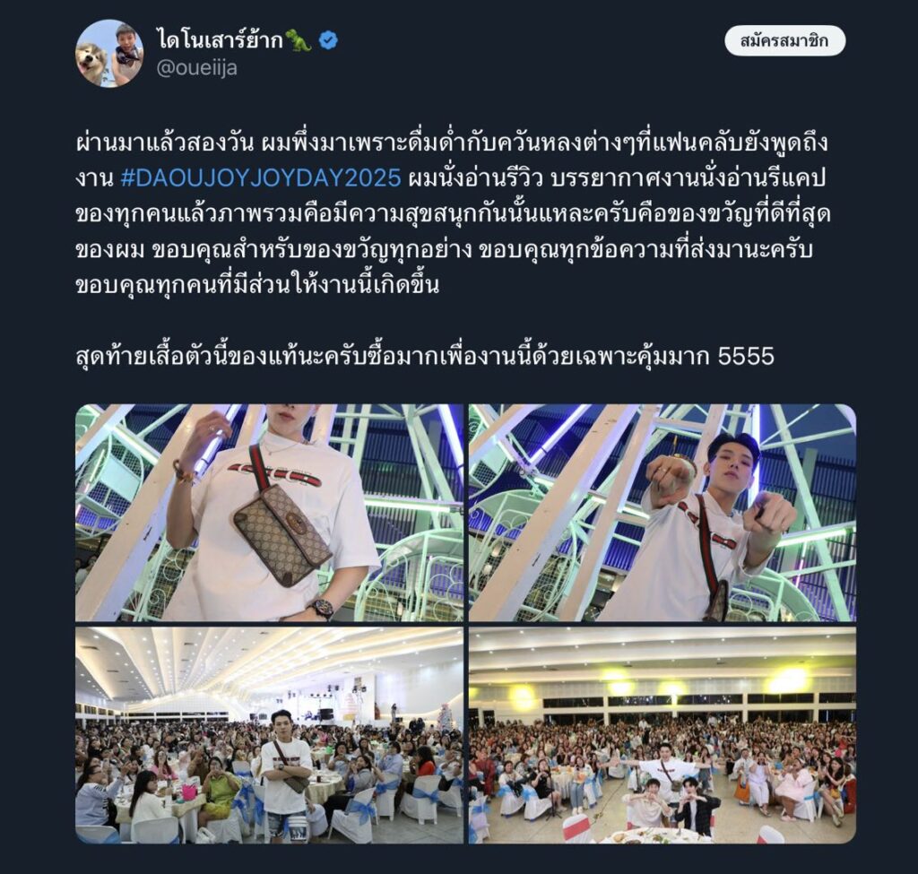 โดยล่าสุด “ต้าห์อู๋” ได้ออกมาโพสต์รูปพร้อมเขียนข้อความผ่าน x ว่า “ผ่านมาแล้วสองวัน ผมพึ่งมาเพราะดื่มด่ำกับควันหลงต่างๆที่แฟนคลับยังพูดถึงงาน #DAOUJOYJOYDAY2025 ผมนั่งอ่านรีวิว บรรยากาศงานนั่งอ่านรีแคปของทุกคนแล้วภาพรวมคือมีความสุขสนุกกันนั้นแหละครับคือของขวัญที่ดีที่สุดของผม ขอบคุณสำหรับของขวัญทุกอย่าง ขอบคุณทุกข้อความที่ส่งมานะครับขอบคุณทุกคนที่มีส่วนให้งานนี้เกิดขึ้น สุดท้ายเสื้อตัวนี้ของแท้นะครับซื้อมาเพื่องานนี้ด้วยเฉพาะคุ้มมาก 5555”