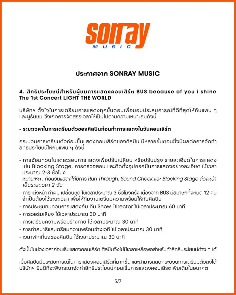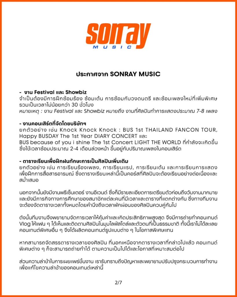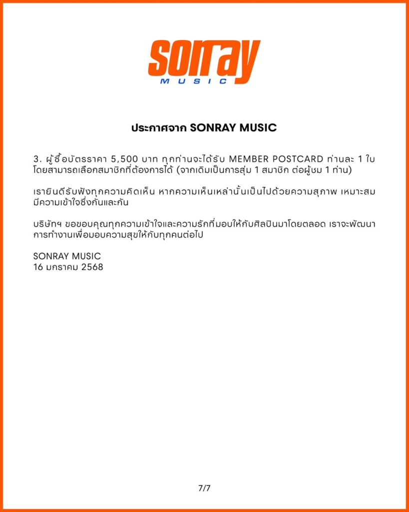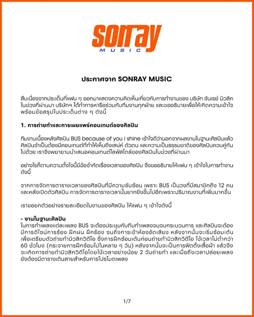 สืบเนื่องจากประเด็นที่แฟน ๆ ออกมาแสดงความคิดเห็นเกี่ยวกับการทำงานของ บริษัท ซันเรย์ มิวสิคในช่วงที่ผ่านมา บริษัทฯ ได้ทำการหารือร่วมกับทีมงานทุกฝ่าย และขออธิบายเพื่อให้เกิดความเข้าใจพร้อมข้อสรุปในประเด็นต่าง ๆ ดังนี้