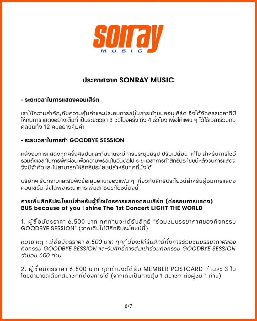 หมายเหตุ : ผู้ซื้อบัตรราคา 6,500 บาท ทุกที่นั่งจะได้รับสิทธิ์ทั้งการร่วมชมบรรยากาศของ กิจกรรม GOODBYE SESSION และรับสิทธิการสุ่มเข้าร่วมกิจกรรม GOODBYE SESSION จำนวน 600 ท่าน