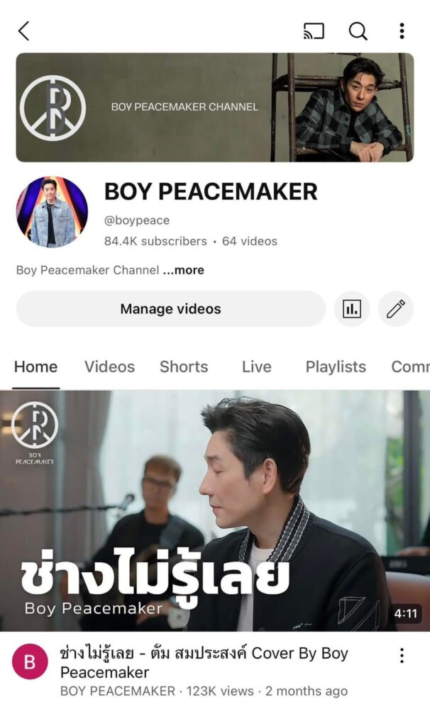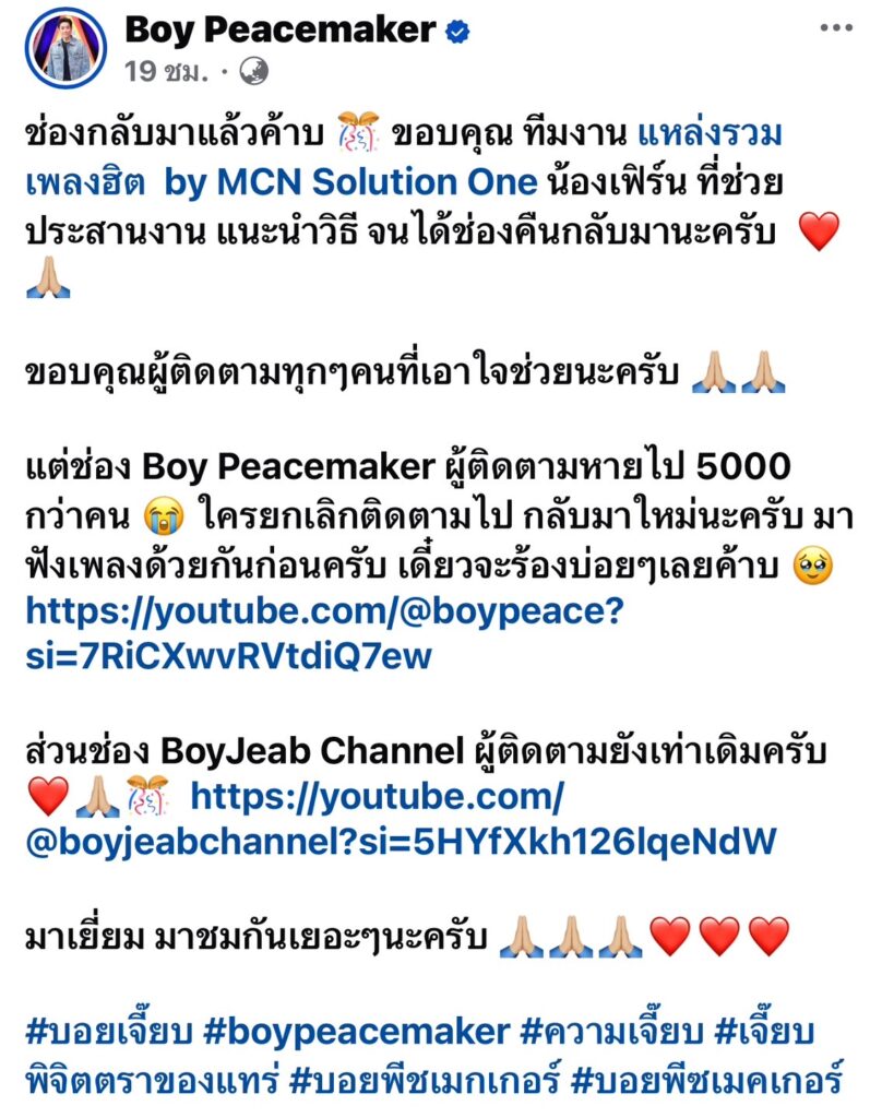 บอย อนุวัฒน์ “ ช่องกลับมาแล้วค้าบ ขอบคุณ ทีมงาน แหล่งรวมเพลงฮิต by MCN Solution One น้องเฟิร์น ที่ช่วยประสานงาน แนะนำวิธี จนได้ช่องคืนกลับมานะครับ ขอบคุณผู้ติดตามทุกๆคนที่เอาใจช่วยนะครับ แต่ช่อง Boy Peacemaker ผู้ติดตามหายไป 5000 กว่าคน ใครยกเลิกติดตามไป กลับมาใหม่นะครับ มาฟังเพลงด้วยกันก่อนครับ เดี๋ยวจะร้องบ่อยๆเลยค้าบ https://youtube.com/@boypeace?si=7RiCXwvRVtdiQ7ew ส่วนช่อง BoyJeab Channel ผู้ติดตามยังเท่าเดิมครับ https://youtube.com/@boyjeabchannel?si=5HYfXkh126lqeNdW