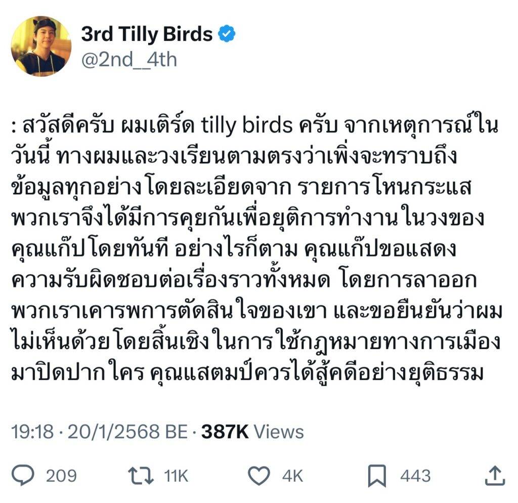 ล่าสุดทางด้าน “เติร์ด tilly birds” ก็ออกมาเคลื่อนไหวหลังดูโหนกระแสจบว่า “สวัสดีครับ ผมเติร์ด tilly birds ครับ จากเหตุการณ์ใน วันนี้ ทางผมและวง เรียนตามตรงว่าเพิ่งจะทราบถึงข้อมูล ทุกอย่างโดยละเอียดจาก รายการโหนกระแส พวกเราจึงได้มีการคุยกันเพื่อยุติการทำงานในวงของคุณแก๊ปโดย ทันที อย่างไรก็ตาม คุณแก๊ปขอแสดงความรับผิดชอบต่อเรื่องราวทั้งหมด โดยการลาออก พวกเราเคารพการตัดสินใจของเขา และขอยืนยันว่าผมไม่เห็นด้วยโดยสิ้นเชิงในการใช้กฎหมายทางการเมืองมาปิดปากใคร คุณแสตมป์ควรได้สู้คดีอย่างยุติธรรม“