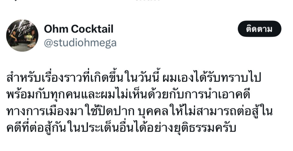 ปิดท้ายกันที่นักร้อง “โอม ค็อกเทล” ที่ออกมาเคลื่อนไหวถึงประเด็นดราม่าของนักร้องหนุ่ม“แสตมป์” หลังไปออกรายการโหนกระแสว่า “สำหรับเรื่องราวที่เกิดขึ้นในวันนี้ ผมเองได้รับทราบไปพร้อมกับทุกคนและผมไม่เห็นด้วยกับการนำเอาคดีทางการเมืองมาใช้ปิดปาก บุคคลให้ไม่สามารถต่อสู้ในคดีที่ต่อสู้กันในประเด็นอื่นได้อย่างยุติธรรมครับ”