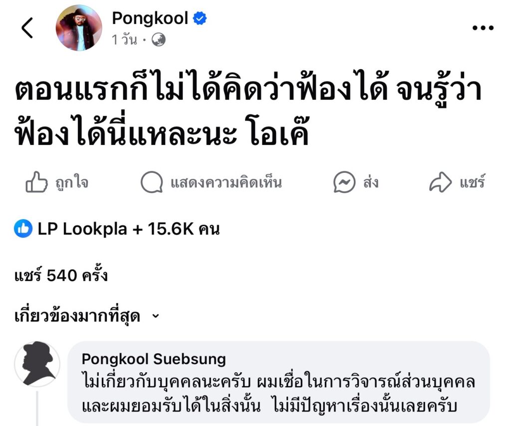 ปิดท้ายนักร้องหนุ่ม “ป๊อบ ปองกูล“ ที่อยู่ดีๆก็ถูกลูกหลงกับดราม่าของนักร้องหนุ่ม ”สแตมป์“ ที่ออกมายอมรับว่านอกใจภรรยา จึงทำให้ชาวเน็ตรวมถึงเพจดังได้ขุดวีรกรรมของนักร้องไทยที่เคยมีข่าวในลักษณะเดียวกัน ซึ่งมีชื่อของ หนุ่ม กะลา และ ป๊อบ ปองกูล ทำให้ถูกแขวนแล้วมีคนมาด่า ล่าสุด หนุ่ม “ป๊อป” ได้ออกมาโพสต์ว่า “ตอนแรกก็ไม่ได้คิดว่าฟ้องได้ จนรู้ว่าฟ้องได้นี่แหละนะ โอเค๊” และได้นำเฟซบุ๊กส่วนตัวมาคอมเมนต์เพิ่มเติมว่า “ไม่เกี่ยวกับบุคคลนะครับ ผมเชื่อในการวิจารณ์ส่วนบุคคล และผมยอมรับได้ในสิ่งนั้น ไม่มีปัญหาเรื่องนั้นเลยครับ”