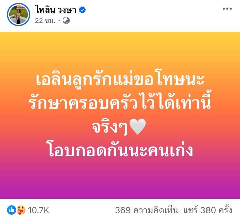เริ่มต้นที่นางงามสาวสวย “แบม ไพลิน” ที่ทำเอาเอ๊ะว่าเกิดอะไรขึ้น เมื่อสาว “แบม” ออกมาโพสต์ข้อความว่า “เห็นแก่ตัว“ ต่อมาก็ได้ออกมาโพสต์อีกว่า ”เอลินลูกรักแม่ขอโทษนะรักษาครอบครัวไว้เท่านี้จริงๆ โอบกอดกันนะคนเก่ง“ ท่ามกลางชาวเน็ตสงสัยหรือว่าส่อแววเตียงหักหรือเปล่า ทั้งนี้ชาวเน็ตยังเข้ามาคอมเม้นต์ส่งกำลังใจให้สาว ”แบมี“ เป็นจำนวนมากซึ่งเรื่องราวมันเป็นยังไงก็ต้องรอเจ้าตัวออกมาเปิดใจเองนะคะ