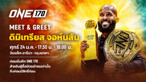 “ดิมิเทรียส จอห์นสัน” อดีตแชมป์โลก ONE MMA รุ่นฟลายเวต (125-135 ป.) เข้าประจำการรอต้อนรับบรรดาแฟนคลับพร้อมพบปะพูดคุยอย่างใกล้ชิด ในช่วงก่อนการแข่งขันศึก ONE 170 วันศุกร์ที่ 24 ม.ค.นี้ ระหว่างเวลา 17.30 -18.00 น. บริเวณประตู 2 อิมแพ็ค อารีนา เมืองทองธานี