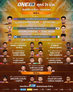 สำหรับศึก ONE 170 มีทัพนักกีฬาเตรียมระเบิดความมันมากถึง 12 คู่ และมีการชิงเข็มขัดกันถึง 3 เส้น โดยคู่เอกนำรายการเป็นการชิงแชมป์โลก ONE มวยไทย รุ่นเฟเธอร์เวต (145-155 ป.) ระหว่าง “ตะวันฉาย พีเค.แสนชัย” เจ้าของบัลลังก์ พบกับ “ซุปเปอร์บอน ซุปเปอร์บอนเทรนนิงแคมป์” ดีกรีแชมป์โลก ONE คิกบ็อกซิ่ง รุ่นเดียวกัน และผู้ท้าชิงอันดับ 1 ของแรงกิง ONE มวยไทย