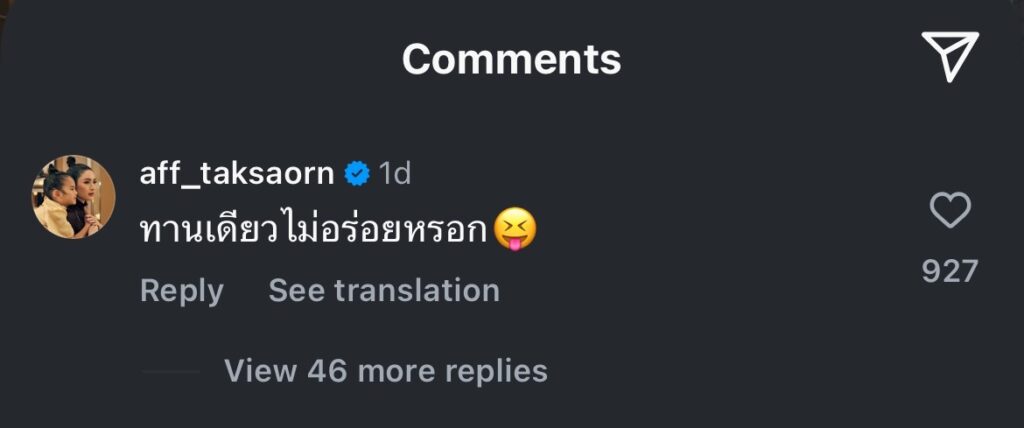 ทำเอาแฟนคลับต่างแห่คอมเมนต์แซวกันสนั่น เช่น ใช่ค่ะ ต้องทานด้วยกัน, คิดถึงแฟนไง รักมากมาย, ไปทายด้วยกันสิคะ, รอโมเมนต์ไปทานด้วยกันอีกนะคะ ฯลฯ