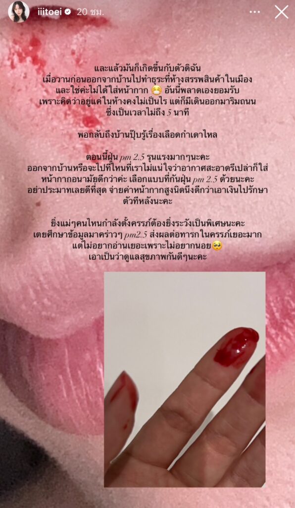 “ใบเตย สุวพิชญ์” แชร์ประสบการณ์โดนฝุ่น PM 2.5เล่นงานเลือดกำเดาไหล ขอบคุณทุกคนเป็นห่วง วอนหน่วยงานที่เกี่ยวข้องเร่งดำเนินการ