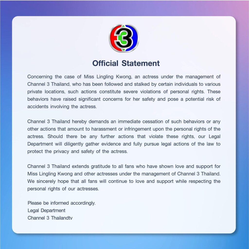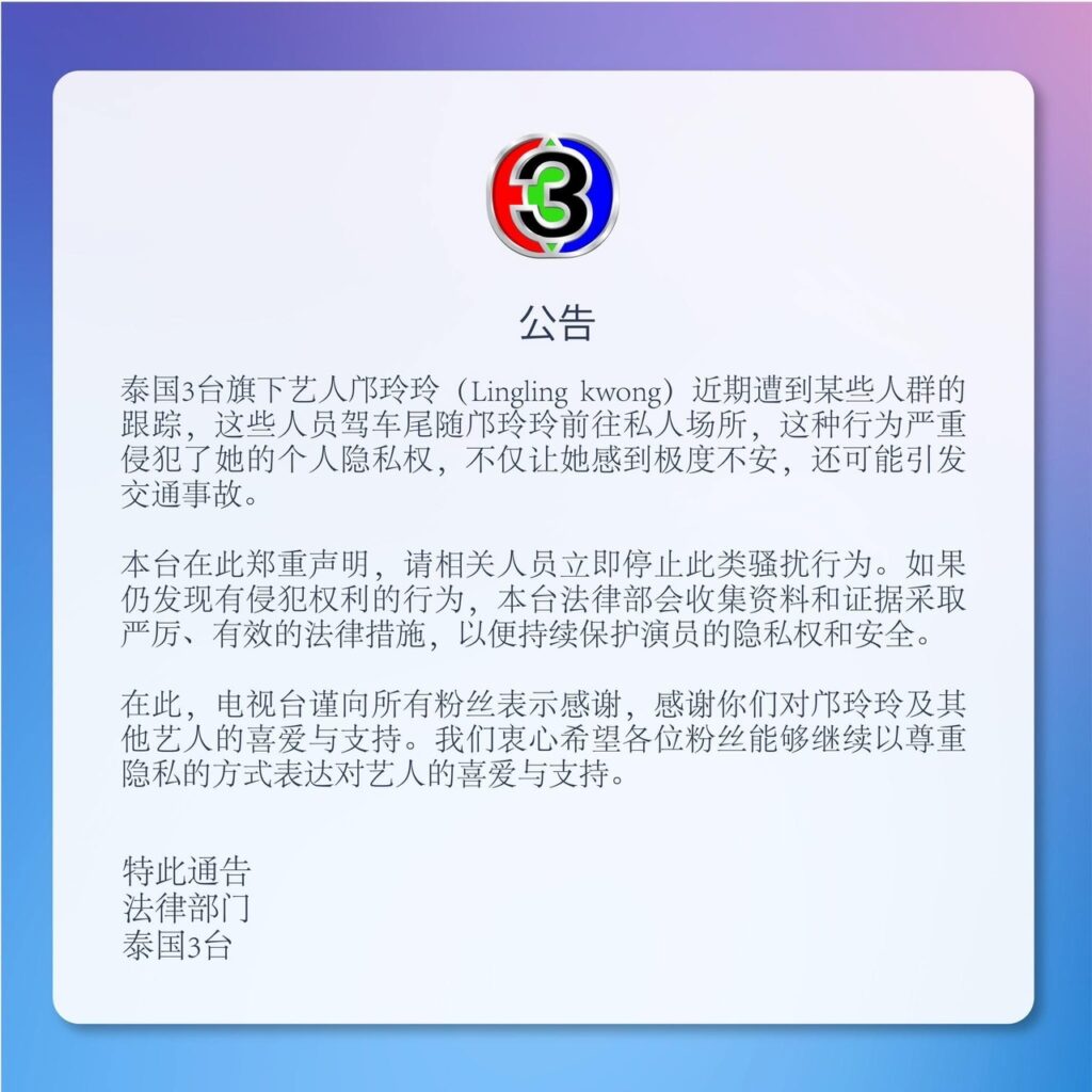 โดยล่าสุดช่อง3 ได้ร่อนจดหมายประกาศว่า“กรณีนักแสดงในสังกัดสถานีโทรทัศน์ไทยทีวีสีช่อง 3 คุณหลิงหลิง คอง ถูกบุคคลบางกลุ่มสะกดรอยตามและขับรถตามไปยังสถานที่ต่าง ๆ อันเป็นพื้นที่ส่วนตัว ซึ่งถือเป็นการกระทำที่ละเมิดต่อสิทธิส่วนบุคคลอย่างร้ายแรง สร้างความวิตกกังวลถึงความไม่ปลอดภัย และอาจทำให้เกิดอุบัติเหตุต่อตัวนักแสดงได้”