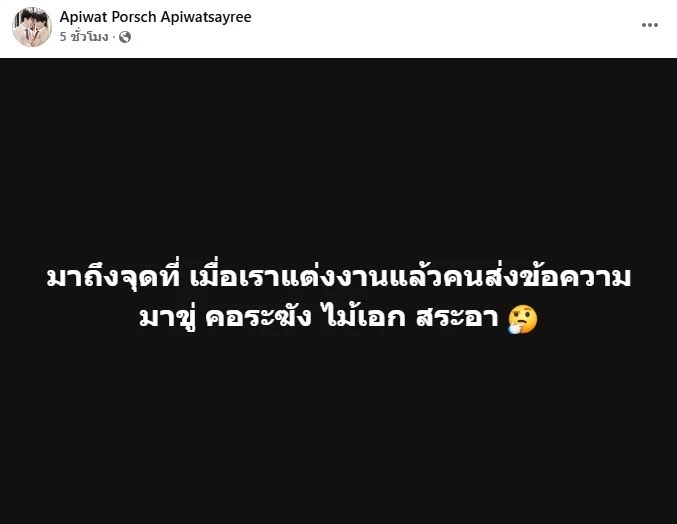 ปิดท้ายกันที่ ”พอร์ช อภิวัฒน์” ที่ก่อนหน้านี้ ได้จูงมือ “อาร์ม สัพพัญญู“ เดินทางไปจดทะเบียนสมรส หลังกฏกมายสมรสเท่าเทียมผ่าน ซึ่งเปิดโอกาสให้ทุกเพศ โดยไม่จำกัด ถือเป็นเรื่องราวที่น่ายินดีให้กับชาว “LGBTQ+“แน่นอนว่ามีบางคนเห็นด้วยแต่ก็ก็มีบางกลุ่มออกมาวิพากษ์วิจารณ์ถึงเรื่องนี้ โดยล่าสุด ทำเอาแฟนคลับตกใจไม่น้อยเมื่อทางด้าน “พอร์ช“ ได้ออกมาโพสต์ข้อความผ่านเฟสบุ๊กว่า “มาถึงจุดที่ เมื่อเราแต่งงานแล้วคนส่งข้อความมาขู่ คอระฆัง ไม้เอก สระอา” ท่ามกลางชาวเน็ตเข้ามาส่งกำลังใจให้อย่างล้นหลาม