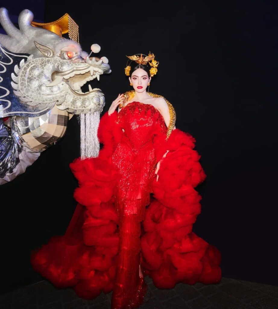 ไปต่อกันที่นักแสดงสาว ”มิ้ลค์ พรรษา“ ที่ต้องบอกเลยว่าสวยเผ็ดรับตรุษจีนมาก โดยสาว ”มิ้ลค์” มาด้วยกันสองลุค โดยลุคแรกเป็นเสื้อสีทองที่มีความทรงพลัง และอีกลุคกับสีแดงดำ ที่มีแซ่บ แบบเฟี้ยสๆ บอกเลยว่าสวยเฮงรับตรุษจีนทั้งสองลุคเลย