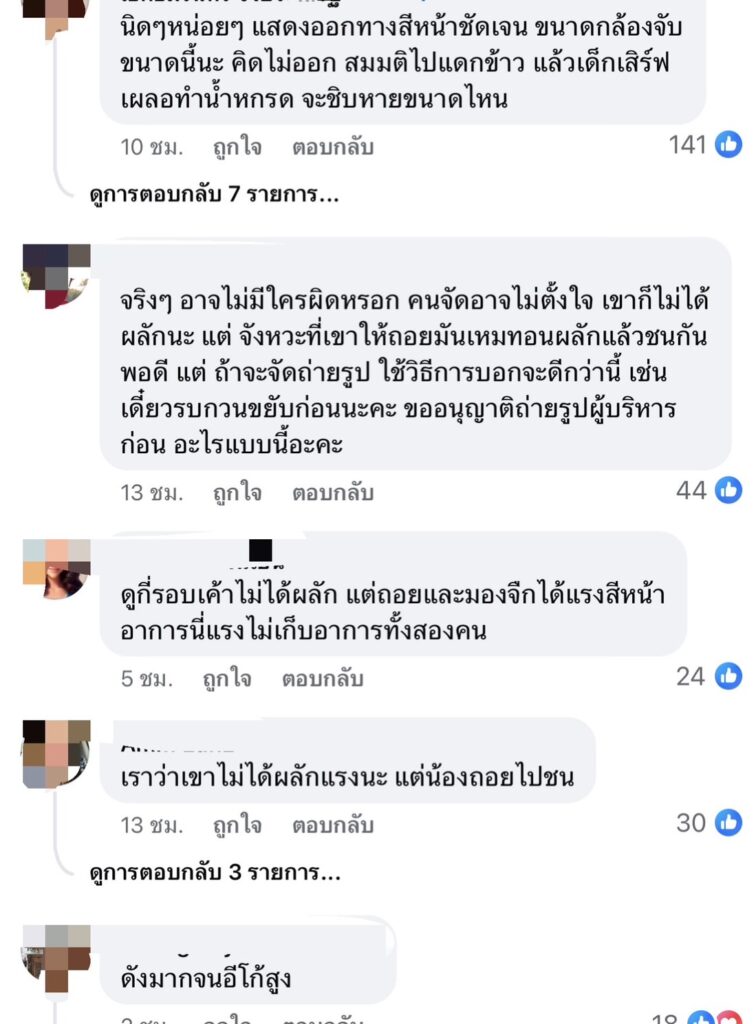 โดยคอมเม้นต์ของชาวเน็ตก็แบ่งเป็นสองเสียงอาทิว่า “นิดๆหน่อยๆ แสดงออกทางสีหน้าชัดเจน ขนาดกล้องจับขนาดนี้นะ คิดไม่ออก สมมติไปแดกข้าว แล้วเด็กเสิร์ฟเผลอทำน้ำหกรด จะชิบหายขนาดไหน ,ดูกี่รอบเค้าไม่ได้ผลัก แต่ถอยและมองจืกได้แรงสีหน้าอาการนี่แรงไม่เก็บอาการทั้งสองคน ,ดังมากจนอีโก้สูงเยอะดูจากสีหน้า