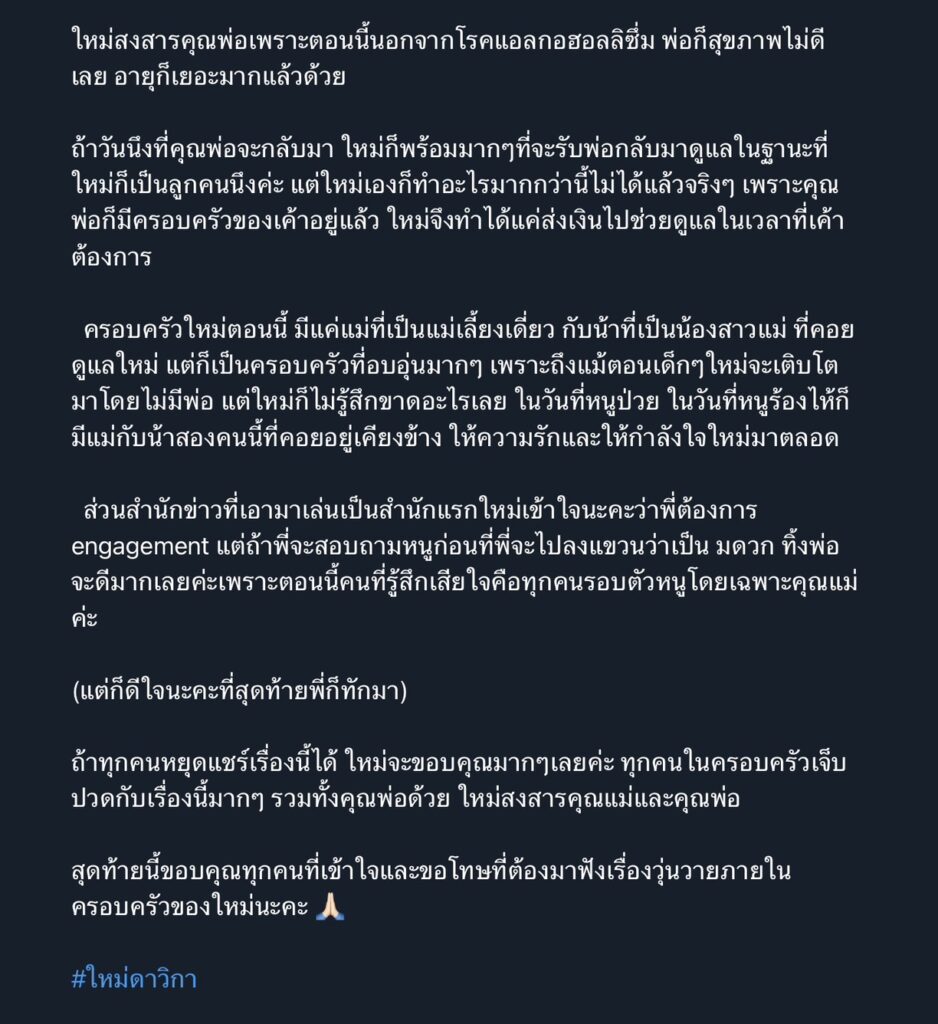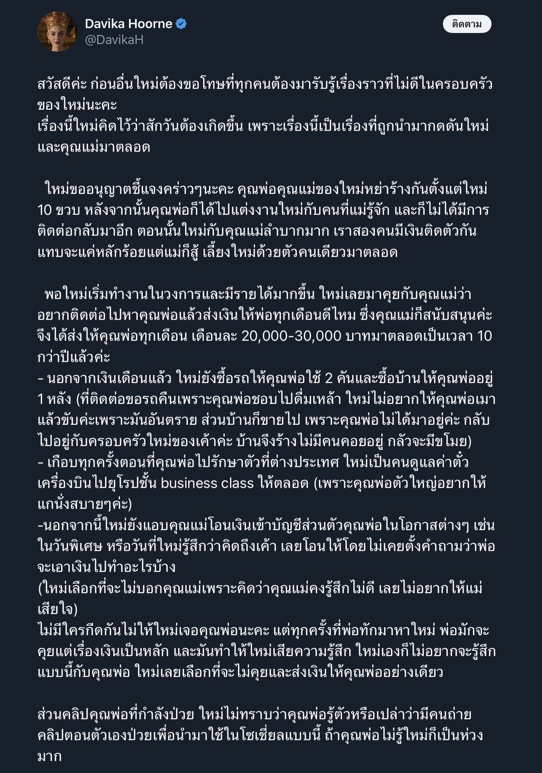 ขยับมาที่นักแสดงสาว “ใหม่ ดาวิกา” ที่เจ้าตัวออกมาชี้แจงหลังโดนดราม่าว่าทิ้งพ่อไม่ดูแลตอนป่วย โดย “ใหม่” เผยว่า “คุณพ่อคุณแม่ของใหม่หย่าร้างกันตั้งแต่ใหม่ 10 ขวบ หลังจากนั้นคุณพ่อก็ได้ไปแต่งงานใหม่กับคนที่แม่รู้จัก และก็ไม่ได้มีการติดต่อกลับมาอีก ตอนนั้นใหม่กับคุณแม่ลำบากมาก เราสองคนมีเงินติดตัวกันแทบจะแค่หลักร้อยแต่แม่ก็สู้ เลี้ยงใหม่ด้วยตัวคนเดียวมาตลอด พอใหม่เริ่มทำงานในวงการและมีรายได้มากขึ้น จึงได้ส่งให้คุณพ่อทุกเดือน เดือนละ 20,000-30,000 บาทมาตลอดเป็นเวลา 10 กว่าปีแล้วค่ะเหตุที่ที่ติดต่อขอรถคืนเพราะคุณพ่อชอบไปดื่มเหล้า ใหม่ไม่อยากให้คุณพ่อเมาแล้วขับค่ะเพราะมันอันตราย ส่วนบ้านก็ขายไป เพราะคุณพ่อไม่ได้มาอยู่ค่ะ“