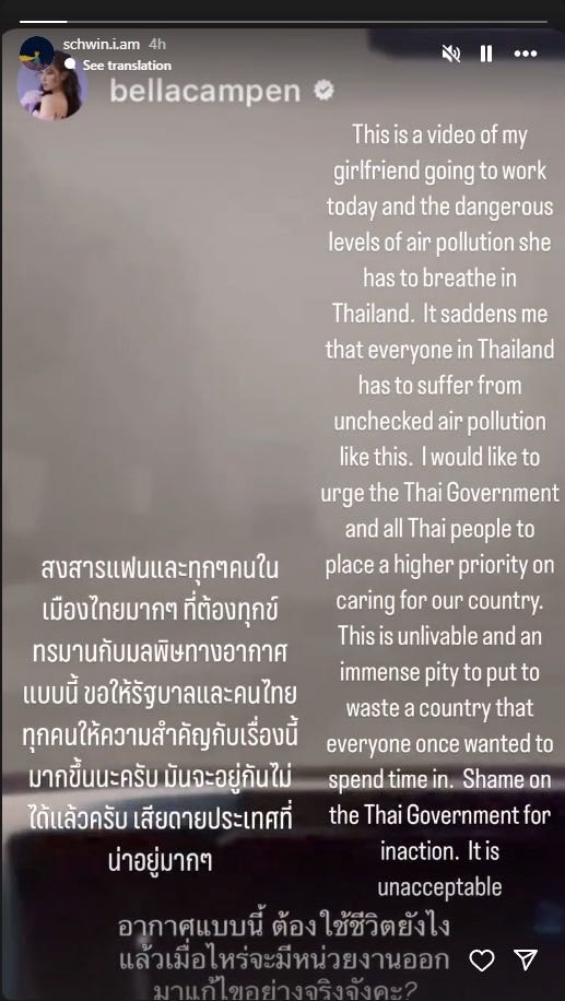 เริ่มต้นกันที่นางเองสาว ”เบลล่า ราณี“ ที่ได้ออกมาโพสต์สตอรี่เป็นคลิปวิดีโอแสดงให้เห็นฝุ่น PM 2.5 ที่ปกคลุมไปทั่วถนนจนทำให้มองแทบไม่เห็นทาง พร้อมตั้งคำถามถึงหน่วยงานที่เกี่ยวข้องที่อยากให้มาแก้ไขปัญหานี้ซักที หลังจากนั้นหวานใจ “ไฮโซหนุ่ม วิล ชวิณ เจียรวนนท์” ก็ได้มารีโพสต์พร้อมข้อความว่า “สงสารแฟนและทุกๆคนในเมืองไทยมากๆ ที่ต้องทนทุกข์ทรมานกับมลพิษทางอากาศแบบนี้ ขอให้รัฐบาลและคนไทยทุกคนให้ความสำคัญกับเรื่องนี้มากขึ้นนะครับ เสียดายประเทศที่น่าอยู่มากๆ” ทำเอาชาวเน็ตโฟกัสประเด็นคำว่าแฟนกันสนั่น