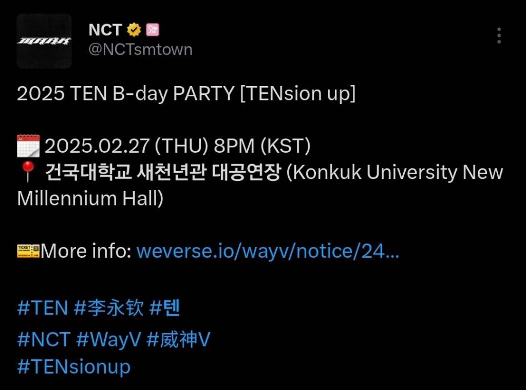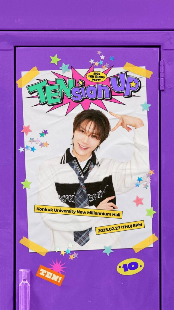 เรียกว่าเพิ่งผ่านการกดบัตรคอนเสิร์ต NCT127 กันไปได้ไม่นานก็มีเรื่องให้วอร์มมือรออีกแล้ว หลังแอคเคาท์ออฟฟิเชี่ยลของวง NCT ประกาศงาน 2025 TEN B-day PARTY [TENsion up] ทำเหล่า 10vely ต่างฮือฮาไม่น้อย โดยงานนี้จะจัดขึ้นที่ประเทศเกาหลี Konkuk University New Millennium Hall ซึ่งจุคนได้ประมาณ 800 คน