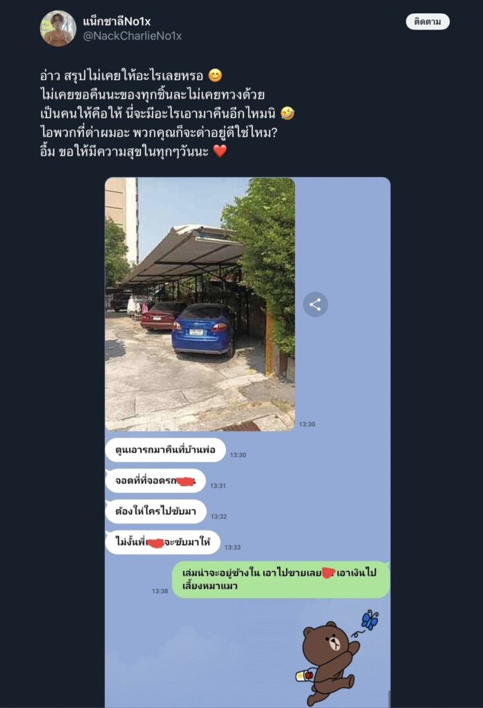 ล่าสุด “แน็ก ชาลี” ได้เคลื่อนไหวผ่านทาง X โพสต์รูปภาพแชตที่มีการพูดคุยกับพี่สาวว่า “ตูน” เอารถมาคืนที่บ้านพ่อ จอดที่ที่จอดรถ ต้องให้ใครไปขับมา ซึ่ง “แน็ก” ก็ตอบกลับไปว่า เล่มน่าจะอยู่ข้างใน เอาไปขายเลย เอาเงินไปเลี้ยงหมาแมว