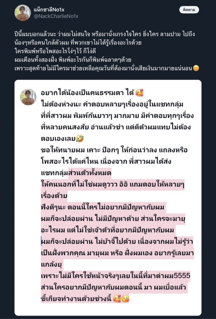 “อยากได้น้องเป็นคนธรรมดา ได้ ไม่ต้องห่วงนะ คำตอบหลายๆ เรื่องอยู่ในแชตกลุ่มที่พี่สาวผมพิมพ์กันยาวมากมาย มีคำตอบทุกเรื่องที่หลายคนสงสัย อ่านแล้วขำ แต่ดีตัวผมแทบไม่ต้องตอบเอง ขอให้ทนายผม เคาะป๊อกๆ ให้ก่อนว่าลง แถลง หรือโพสต์อะไรได้แค่ไหน เนื่องจากพี่สาวผมได้ส่งแชตกลุ่มส่วนตัวทั้งหมดหื้คนนอกที่ไม่ใช่ผมดูววว อิอิ แถมตอบให้หลายๆ เรื่องด้วย”