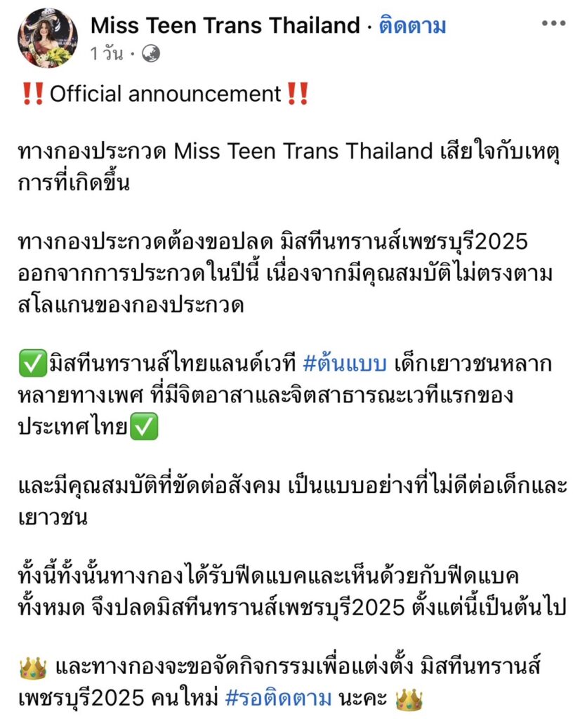 ล่าสุดทางด้านเพจเวที Miss Teen Trans Thailand ได้ออกมาลงดาบ ด้วยการปลด “แพร” ฟ้าผ่าออกมาจากตำแหน่ง โดยได้โพสต์ภาพ พร้อมแคปชั่นว่า “ทางกองประกวด Miss Teen Trans Thailand เสียใจกับเหตุการที่เกิดขึ้น ทางกองประกวดต้องขอปลด มิสทีนทรานส์เพชรบุรี2025 ออกจากการประกวดในปีนี้ เนื่องจากมีคุณสมบัติไม่ตรงตามสโลแกนของกองประกวด มิสทีนทรานส์ไทยแลนด์เวที #ต้นแบบ เด็กเยาวชนหลากหลายทางเพศ ที่มีจิตอาสาและจิตสาธารณะเวทีแรกของประเทศไทยและมีคุณสมบัติที่ขัดต่อสังคม เป็นแบบอย่างที่ไม่ดีต่อเด็กและเยาวชน ทั้งนี้ทั้งนั้นทางกองได้รับฟีดแบคและเห็นด้วยกับฟีดแบคทั้งหมด จึงปลดมิสทีนทรานส์เพชรบุรี2025 ตั้งแต่นี้เป็นต้นไป”