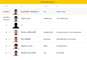 ส่วนอันดับที่ 5 ได้แก่ “น้องโอ๋ ฮาม่ามวยไทย” อดีตราชันของรุ่นนี้ ที่ร่วงลงมา 1 อันดับ และไฟต์ล่าสุดเพิ่งลดพิกัดลงไปชกในรุ่นฟลายเวต (125-135 ป.) ครั้งแรกใน ONE โดยสามารถสู้กับ “ก้องธรณี ส.สมหมาย” รุ่นน้องเจ้าของตำแหน่งผู้ท้าชิงอันดับ 4 ของแรงกิง ONE มวยไทย รุ่นฟลายเวต ได้อย่างสุดมัน ก่อนพ่ายด้วยคะแนนไม่เอกฉันท์ ในศึก ONE Fight Night 28 เมื่อช่วงเช้าวันเสาร์ที่ 8 ก.พ.ที่ผ่านมา