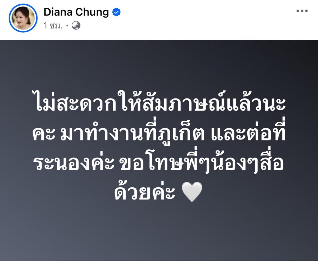 ต่อมาเจ้าตัวก็ออกมาโพสต์เพิ่มอีกว่า “สะดวกให้สัมภาษณ์แล้วนะคะ มาทำงานที่ภูเก็ตและต่อระนองค่ะ ขอโทษพี่ๆน้องๆสื่อด้วยค่ะ“
