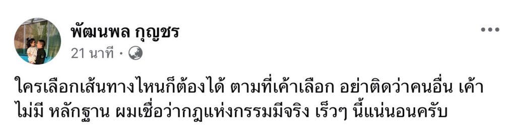 ล่าสุดทางด้าน “ดีเจแมน” ก็ออกมาเคลื่อนไหว โดยการโพสต์ข้อความว่า “ใครเลือกเส้นทางไหนก็ต้องได้ ตามที่เค้าเลือก อย่าติดว่าคนอื่น เค้าไม่มี หลักฐาน ผมเชื่อว่ากฎแห่งกรรมมีจริง เร็วๆ นี้แน่นอนครับ”
