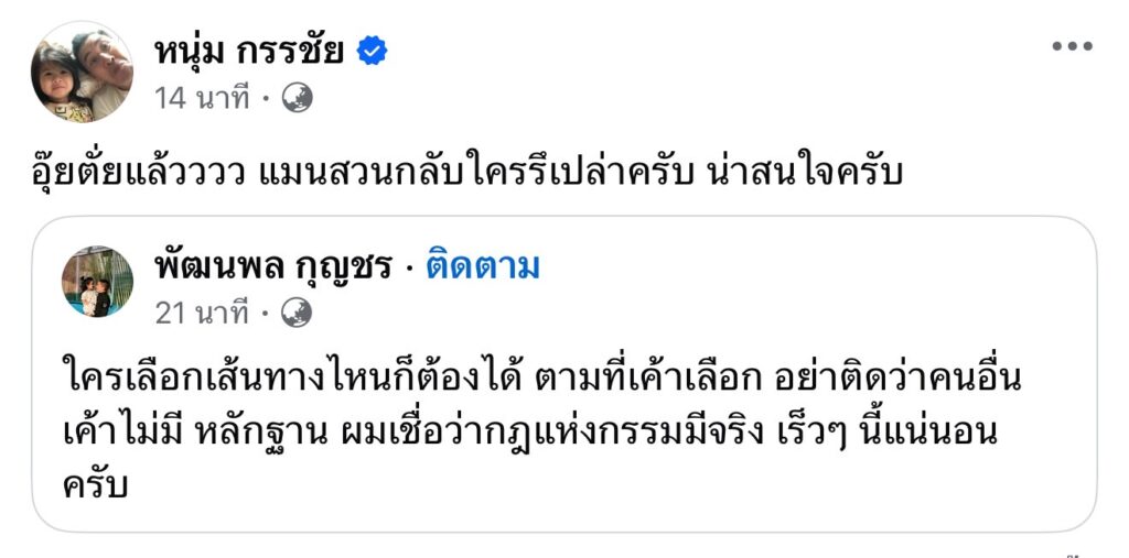 งานนี้ “พี่หนุ่ม” ของเรา ก็ไม่อยู่นิ่งรีบออกมาแชร์ข้อความที่ “ดีเจแมน” โพสต์พร้อมเขียนแคปชั่นว่า “อุ๊ยตั่ยแล้วววว แมนสวนกลับใครรึเปล่าครับ น่าสนใจครับ”