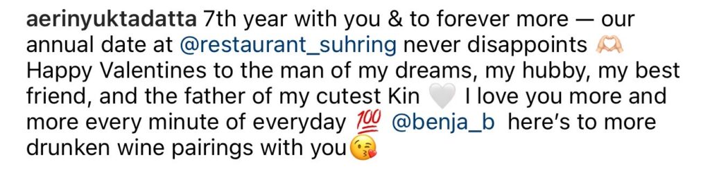 ล่าสุดเสิร์ฟความหวานต่อไม่รอแล้วนะ โดยสาว “แอริน” ได้ควง “ไฮโซเบญ” ดินเนอร์ในวันครบรอบ7ปี ซึ่งต้องบอกเลยว่าหวานจนมดขึ้นไอจีกันเลยทีเดียว ซึ่งสาว “แอริน” ได้ออกมาโพสต์ภาพ พร้อมแคปชั้นสุดซึ้งว่า “7th year with you & to forever more — our annual date at @restaurant_suhring never disappoints 🫶🏻 Happy Valentines to the man of my dreams, my hubby, my best friend, and the father of my cutest Kin 🤍 I love you more and more every minute of everyday 💯 @benja_b here’s to more drunken wine pairings with you😘“