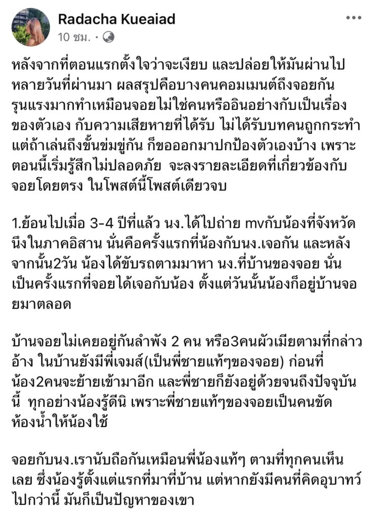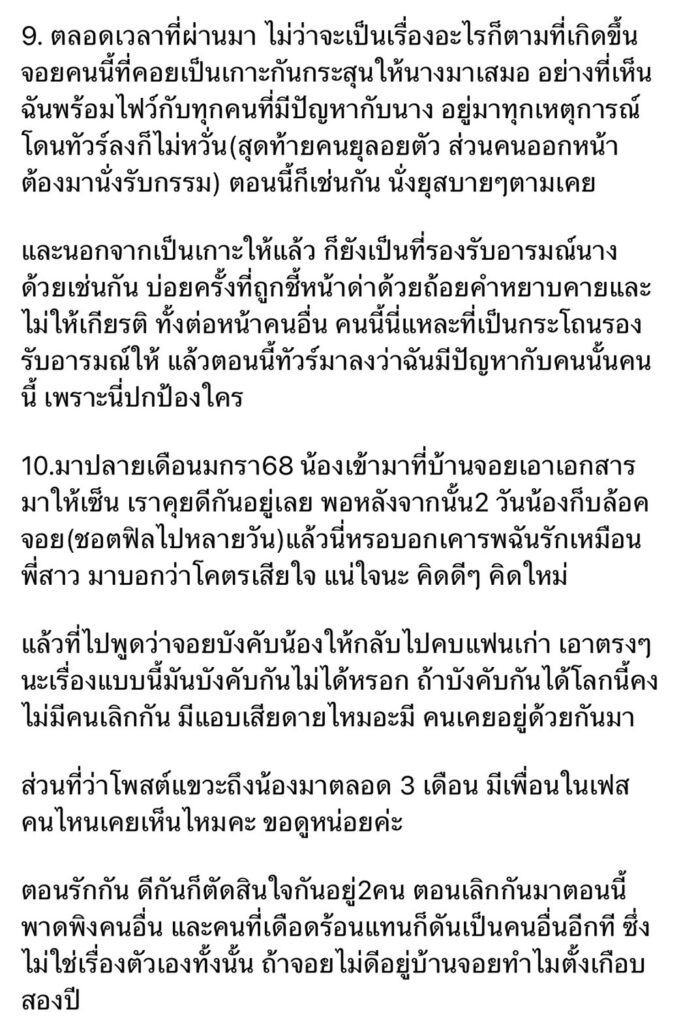 “10.มาปลายเดือนมกรา68 น้องเข้ามาที่บ้านจอยเอาเอกสารมาให้เซ็น เราคุยดีกันอยู่เลย พอหลังจากนั้น2 วันน้องก็บล็อคจอย(ชอตฟิลไปหลายวัน)แล้วนี่หรอบอกเคารพฉันรักเหมือนพี่สาว มาบอกว่าโคตรเสียใจ แน่ใจนะ คิดดีๆ คิดใหม่”