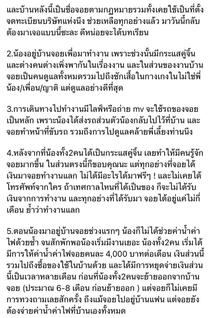 “5.ตอนน้องมาอยู่บ้านจอยช่วงแรกๆ น้องก็ไม่ได้ช่วยค่าน้ำค่าไฟด้วยซ้ำ จนสักพักพอน้องเริ่มมีงานเยอะ น้องทั้ง2คน เริ่มได้มีการให้ค่าน้ำค่าไฟจอยคนละ 4,000 บาทต่อเดือน เงินส่วนนี้รวมไปถึงซื้อของใช้ในบ้านด้วย และได้มีการหยุดจ่ายเงินส่วนนี้เป็นเวลาหลายเดือน ก่อนที่น้องทั้ง2คนจะย้ายออกจากบ้านจอย (ประมาณ 6-8 เดือน ก่อนย้ายออก ) แต่จอยก็ไม่เคยมีการทวงถามเลยสักครั้ง ถึงแม้จอยไปอยู่บ้านแฟน แต่จอยยังต้องจ่ายค่าน้ำค่าไฟที่บ้านเองทั้งหมด”