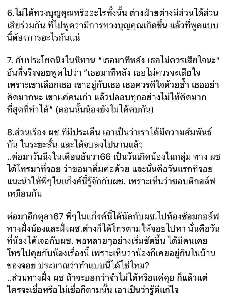 “ต่อมาอีกตุลา67 พี่ๆในแก็งค์นี้ได้นัดกับผช.ไปห้องซ้อมกอล์ฟ ทางฝั่งน้องและฝั่งผช.ต่างก็ได้โทรตามให้จอยไปหา นั่นคือวันที่น้องได้เจอกับผช. พอหลายๆอย่างเริ่มชัดขึ้น ได้มีคนเคยโทรไปคุยกับน้องเรื่องนี้ เพราะเห็นว่าน้องก็เคยอยู่กินในบ้านของจอย ประมาณว่าทำแบบนี้ได้ใช่ไหม?