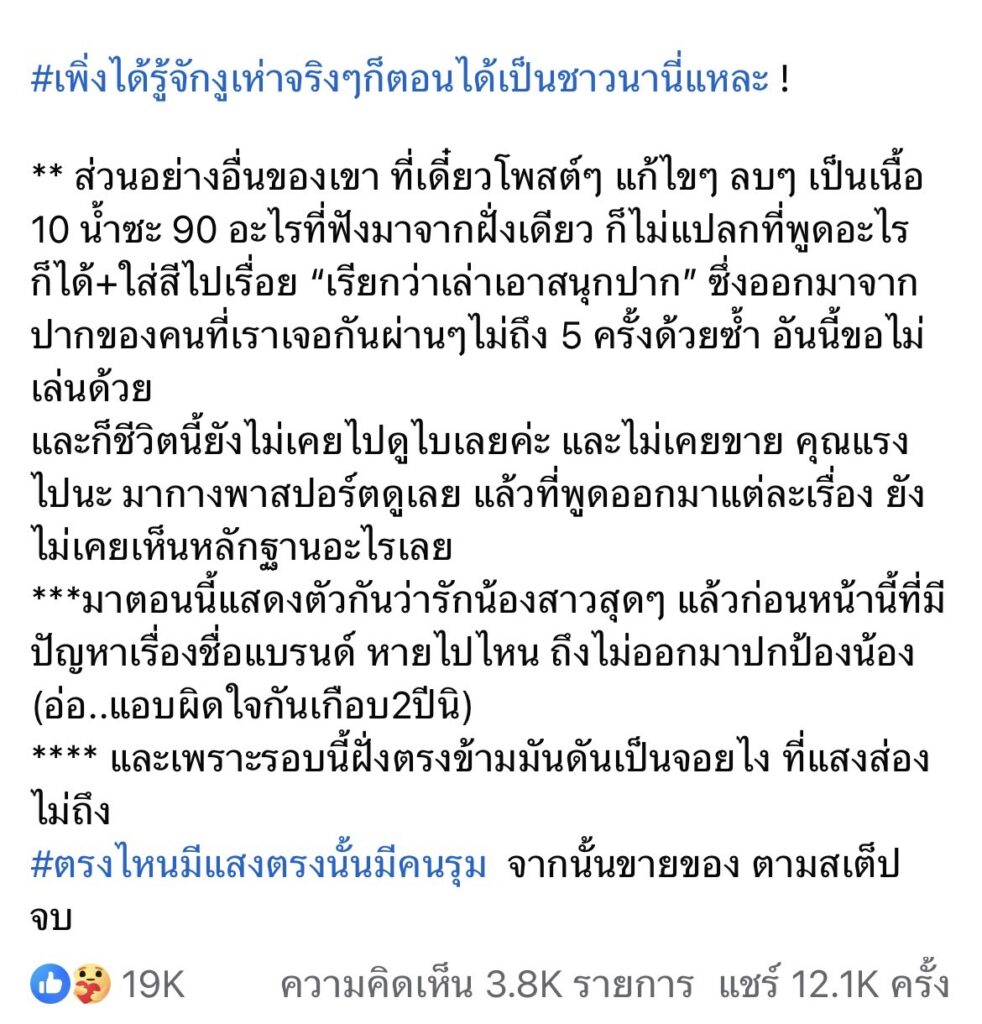 “มาตอนนี้แสดงตัวกันว่ารักน้องสาวสุดๆ แล้วก่อนหน้านี้ที่มีปัญหาเรื่องชื่อแบรนด์ หายไปไหน ถึงไม่ออกมาปกป้องน้อง (อ่อ..แอบผิดใจกันเกือบ2ปีนิ) **** และเพราะรอบนี้ฝั่งตรงข้ามมันดันเป็นจอยไง ที่แสงส่องไม่ถึง #ตรงไหนมีแสงตรงนั้นมีคนรุม จากนั้นขายของ ตามสเต็ป จบ”