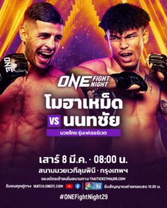 เผยโฉมคู่มวยเด็ดเตรียมระเบิดความมันในศึก ONE Fight Night 29 ที่จะถ่ายทอดสดจากสนามมวยเวทีลุมพินี (รามอินทรา) ในช่วงไพรม์ไทม์อเมริกา ซึ่งตรงกับช่วงเช้าเวลา 08:00 น. ในวันเสาร์ที่ 8 มี.ค.68 โดย “โมฮาเหม็ด ยูเนส ราบาห์” มวยอาวุธเดือด วัย 27 ปี จากแอลจีเรีย จะเจอกับ “นนทชัย จิตรเมืองนนท์” นักชกดีกรีแชมป์ Road To ONE Thailand ซีซัน 2 วัย 25 ปีจากชุมพร ที่จะมาปรากฏตัวครั้งแรกใน ONE รายการใหญ่ โดยทั้งคู่จะสู้กันในกติกามวยไทย รุ่นเฟเธอร์เวต (145-155 ป.)