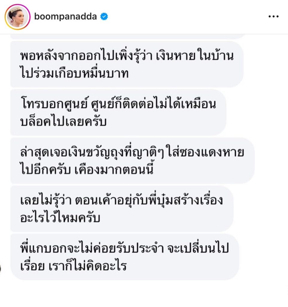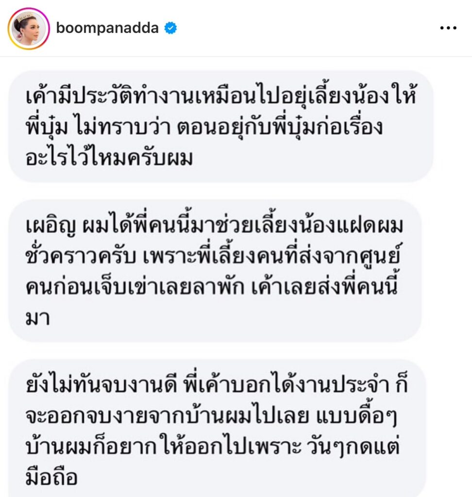 เรียกว่าต้องออกมาประกาศเตือนภัยกันเลยทีเดียว สำหรับ “บุ๋ม ปนัดดา” หลังจากโดนพี่เลี้ยงขโมยเงินจำนวนหนึ่ง โดย “บุ๋ม ปนัดดา” ออกมาโพสต์ภาพ พร้อมแคปชั่นว่า “ เตือนภัยมิจฉาชีพที่จริงเรื่องนี้เกิดกับบุ๋มเมื่อหนึ่งเดือน ทีแล้วค่ะ(25กพ)เป็นพีเลียงที่มาจากศูนย์อยู่กับเรามาสองเดือนแต่มี ความจำเป็นต้องให้ออกเพราะพีเค้าขโมยเงินไป30,000บาท(ตอนนั้น กดเงินสดมาเพื่อใส่ซองตรุษจีนค่ะ)และไม่แน่ใจว่าตอนหลังที่มาค้นเจอ ว่าเงินอีก10,000กว่าบาทรวมทั้งแว่นกันแดด20,000กว่าบาทหายไป ด้วยจะเอาไปด้วยอีกไหม?พี่เค้ารับสารภาพเรื่อง30,000ค่ะแล้วก็บอก ว่าจะทำงานชดใช้เพียงแต่ว่าที่บ้านเราไม่สามารถไว้ใจได้อีกก็เลยให้ค่า รถกลับไปพร้อมก็บอกเขาว่าอย่าไปทำกับใครอีกบุ้มจะไม่แจ้งความและ จะไม่บอกใครเพราะคิดอยู่เสมอว่าการให้โอกาสคนคือสิ่งที่มีค่าที่สุดและ อยากให้พี่ได้ใช้โอกาสที่มีไปสร้างอาชีพที่ดีเริ่มต้นใหม่ให้ดีแต่เปล่าเลย ค่ะบุ้มได้รับการติดต่อจากคุณหมอท่านหนึ่งดังข้อความที่เห็นบุ้มรู้สึก เสียใจมากที่ให้โอกาสพี่เค้าและรู้สึกเสียใจกับอีกบ้านนึ่งที่พี่เค้าเอาชื่อบุ้ม ไปแอบอ้างเพื่อการหางานกับศูนย์พี่เลี้ยงที่ใหม่พร้อมกับชื่อใหม่แล้วไป ขโมยเงินเค้าแบบนี้คุณหมอบอกว่าที่ยอมรับพี่เลี้ยงคนนี้เพราะเห็นว่าเคย เลี้ยงลูกบ้านคุณบุ้ม(6)บุ๋มก็เลยตกลงกับคุณหมอว่าเรามีความจำเป็นที่ จะต้องไปแจ้งความเพื่อให้มีประวัติอาชญากรรมเพื่อไม่ให้ไปทำกับบ้าน อื่นอีกและขอลงประกาศว่าพี่เลี้ยงคนนี้มีพฤติกรรมที่ไม่เหมาะสมและไม่ อนุญาตให้ศูนย์พี่เลี้ยงที่ใหม่เอาไปอ้างอิงแบบนี้ค่ะ#เสียใจมากเลยค่ะ ตอนนี่”