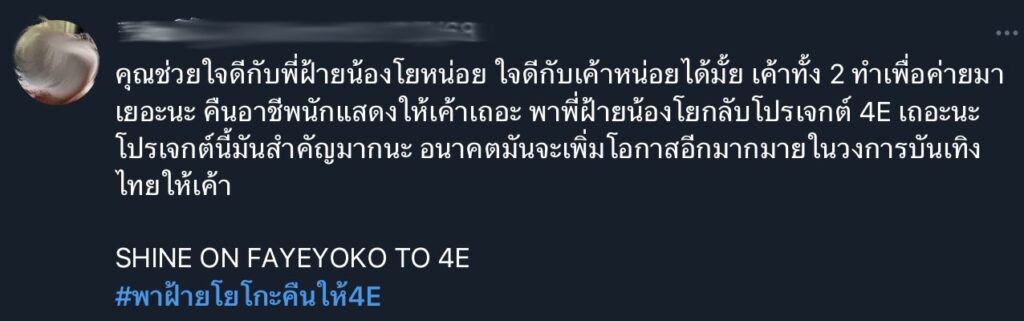 ไทมไลน์ลือสนั่น ”ฝ้าย-โยโกะ” ถูกแยกคู่ ดราม่าสนั่นพุ่งขึ้นเทรนด์ ด้านแฟนคลับออกมาเรียกร้องให้ กลับเข้าร่วมโปรเจกต์ 4 Elements เหมือนเดิม ดันแฮชแท็ก #ฝ้ายโยโกะควรได้รับความเป็นธรรม และ #พาฝ้ายโยโกะคืนให้4E