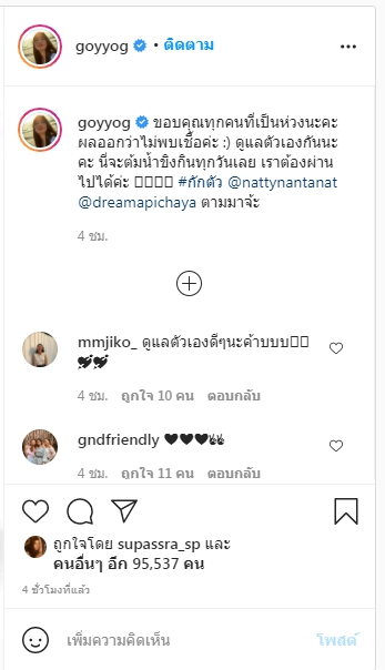 “ขอบคุณทุกคนที่เป็นห่วงนะคะ ผลออกว่าไม่พบเชื้อค่ะ 🙂 ดูแลตัวเองกันนะคะ นี่จะต้มน้ำขิงกินทุกวันเลย เราต้องผ่านไปได้ค่ะ #กักตัว @nattynantanat @dreamapichaya ตามมาจ้ะ”