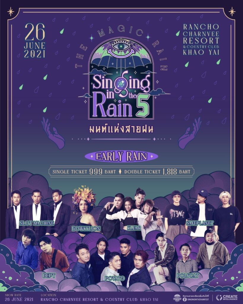 เมื่อฤดูฝนวนกลับมาอีกครั้ง ความสุข ความสนุกไปกับเสียงเพลง และบรรยากาศแห่งรอยยิ้มก็จะวนกลับมาเช่นกัน เทศกาลดนตรีในฤดูฝน Singing in The Rain Music Festival ครั้งที่ 5 จะกลับมาร่ายมนตร์แห่งสายฝน “The Magic Rain” ให้ชุ่มฉ่ำ เขาใหญ่ นครราชสีมา ไปกับเหล่าศิลปินที่ถูกคัดสรร ได้แก่ POTATO, BOWKYLION, POLYCAT, SLOT MACHINE, KLEAR, SAFEPLANETและ DEPT พร้อมมาตามหาคำทำนายแห่งสายฝนไปกับเหล่ามาสเตอร์ศาสตร์ไพ่ ที่จะมารวมตัวกันมากที่สุดในเทศกาลดนตรี ณ สนามกอล์ฟแรนโช ชาญวีร์ รีสอร์ท เขาใหญ่ จัดขึ้นในวันเสาร์ที่ 26 มิถุนายน 2564 นี้