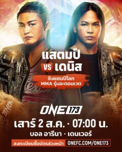 โดยหนึ่งในคู่ชูโรงของศึก ONE 173 ที่ประกาศออกมาอย่างเป็นทางการ จะเป็นการเปิดศึกเพื่อนรักหักเหลี่ยมโหดเพื่อช่วงชิงตำแหน่งราชินี MMA เพียงหนึ่งเดียวของรุ่นอะตอมเวต (105-115 ป.) ระหว่าง “แสตมป์ แฟร์เท็กซ์” สาวแกร่งใจเกินร้อยจากระยอง แชมป์โลก ONE MMA รุ่นอะตอมเวตหญิง คนปัจจุบัน และ “เดนิส แซมโบอันกา” เพื่อนรักขาลุยจากฟิลิปปินส์ เจ้าของตำแหน่งแชมป์โลกเฉพาะกาลของรุ่นนี้