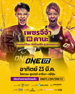ศึก ONE 172 รายการแข่งขันศิลปะการต่อสู้ครั้งยิ่งใหญ่ที่สุดในรอบ 30 ปี ของประเทศญี่ปุ่น  ในวันอาทิตย์ที่ 23 มี.ค.68 ซึ่งมีนักชกสายเลือดไทยยกทัพไปถล่มแดนซามูไรทั้งหมด 9 คน โดยมี 5 คนที่จะได้ลงศึกชิงเข็มขัดถึง 4 เส้น ในอีเวนต์นี้