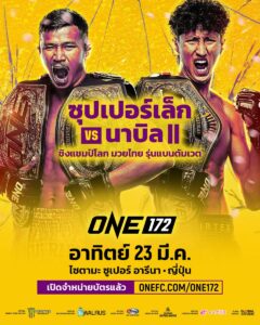 สำหรับศึก ONE 172 ถือเป็นรายการแข่งขันศิลปะการต่อสู้ครั้งยิ่งใหญ่ที่สุดในรอบ 30 ปี ที่จะเกิดขึ้นในญี่ปุ่น ชูโรงด้วยคู่มวยนัดหยุดโลกที่ทุกคนเฝ้ารอคอย “ทาเครุ เซกาวา” นักชกซูเปอร์สตาร์เจ้าถิ่น จะเปิดศึกดวลกำปั้นกับ “รถถัง จิตรเมืองนนท์” อดีตแชมป์โลก ONE มวยไทย รุ่นฟลายเวต (125-135 ป.) ในกติกาคิกบ็อกซิ่ง รุ่นฟลายเวต ซูเปอร์ไฟต์ 5 ยก รวมถึงยังมีการแข่งขันชิงเข็มขัดแชมป์โลก ONE จัดเต็มอีกถึง 5 คู่ในอีเวนต์เดียว