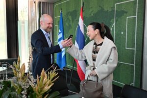 วันที่ 6 มีนาคม 2568 “มาดามแป้ง” นวลพรรณ ล่ำซำ นายกสมาคมกีฬาฟุตบอลฯ ยังอยู่ที่สำนักงานใหญ่ ฟีฟ่า ที่ซูริค ประเทศสวิตเซอร์แลนด์ เพื่อเยี่ยมชมในส่วนต่าง ๆ ของสำนักงานใหญ่ ทั้ง FIFA Headquarters และ FIFA Auditorium พร้อมแลกเปลี่ยนความคิดเห็นกับ มาธิอัส กราฟสตรอม เลขาธิการ ฟีฟ่า เกี่ยวกับแนวทางการพัฒนาฟุตบอลไทยในอนาคต