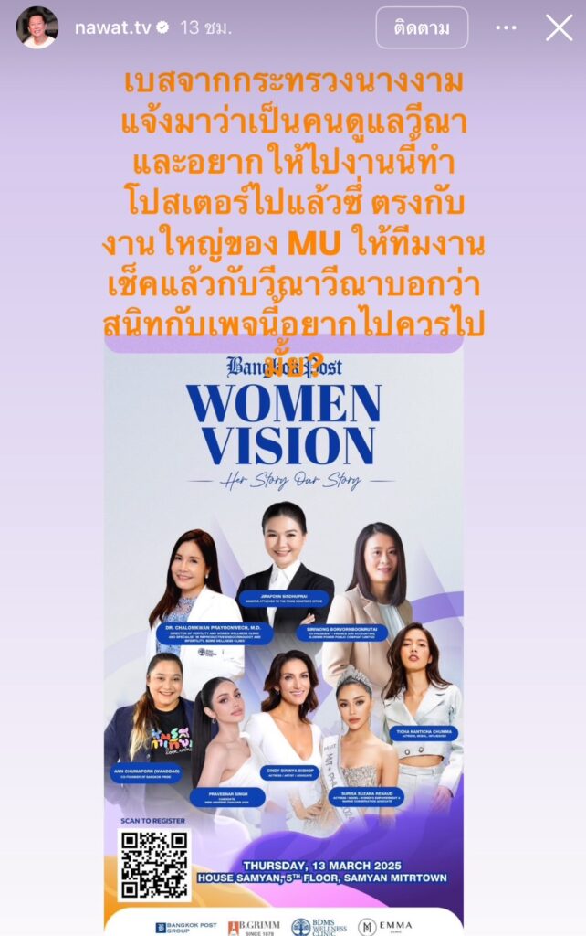 ตกเป็นประเด็นบนโลกออนไลน์ต่างสงสัยว่าเอ๊ะเกิดอะไรขึ้น เมื่อทางด้านสตอรี่ส้มกลับมาอีกครั้ง โดยก่อนหน้านี้ทาง ”บอสณวัฒน์“ ได้ออกมาโพสต์ข้อความภาพอีเว้นท์งานหนึ่งลงในไอจีสตอรี่ พร้อมเขียนข้อความว่า “เบสแจ้งกระทรวงนางงามแจ้งมาว่าเป็นคนดูแลวีณา และอยากให้ไปงานนี้ ทำโปสเตอร์ไปแล้วซึ่ ตรงกับงานใหญ่ MU ให้ทีมงานเช็คแล้วกับวีณา วีณา บอกสนิทกับเพจนี้อยากไป ควรไปมั้ย?“