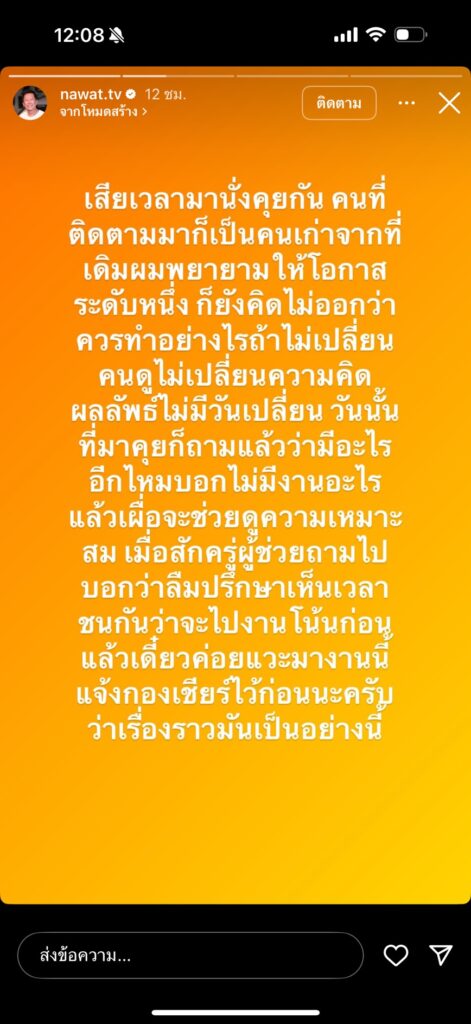 และต่อมาได้โพสต์สตอรี่ส้มอีกว่า “เสียเวลามานั่งคุยกัน คนที่ติดตามมาก็เป็นคนเก่าจากที่เดิมผมพยายามให้โอกาสระดับหนึ่ง ก็ยังคิดไม่ออกว่าควรทำอย่างไรถ้าไม่เปลี่ยนคนดูไม่เปลี่ยนความคิดผลลัพธ์ไม่มีวันเปลี่ยน วันนั้นที่มาคุยก็ถามแล้วว่ามีอะไรอีกไหม บอกไม่มีงานอะไรแล้ว เผื่อจะช่วยดูความเหมาะสม
