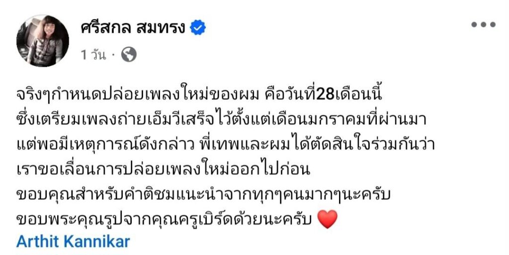 ล่าสุด “ปุ้ย” ได้ออกมาแจ้งข่าวผ่านโซเชียลมีเดียเกี่ยวกับการเลื่อนปล่อยซิงเกิลใหม่ ซึ่งเดิมมีกำหนดเผยแพร่ในวันที่ 28 มีนาคมนี้ โดยเจ้าตัวเผยว่า “จริงๆ กำหนดปล่อยเพลงใหม่ของผม คือวันที่ 28 เดือนนี้ (มี.ค.) ซึ่งเตรียมเพลงถ่ายเอ็มวีเสร็จไว้ตั้งแต่เดือนมกราคมที่ผ่านมา แต่พอมีเหตุการณ์ดังกล่าว พี่เทพและผม ได้ตัดสินใจร่วมกันว่า เราขอเลื่อนการปล่อยเพลงใหม่ออกไปก่อน ขอบคุณสำหรับคำติชมแนะนำจากทุกๆ คนมากๆ นะครับ ขอบพระคุณรูปจากคุณครูเบิร์ดด้วยนะครับ ❤ Arthit Kannikar”