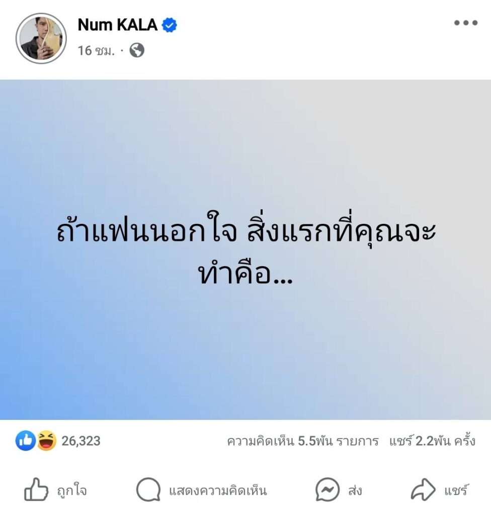 ล่าสุด “หนุ่ม” ได้โพสต์ข้อความตั้งคำถามที่สร้างกระแสในโซเชียลว่า “ถ้าแฟนนอกใจ สิ่งแรกที่คุณจะทำคือ…”