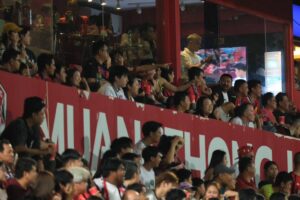 ครึ่งหลัง เมืองทอง ยังโหมเกมต่อเพื่อทวงประตูคืน แต่กลับถูกจังหวะเตะมุมที่ ปกรณ์ เปรมภักดิ์ เปิดเข้ามากลางประตูให้ ธนบูรณ์ เกษารัตน์ โขกตุงตาข่าย การท่าเรือ นำห่าง 2-0