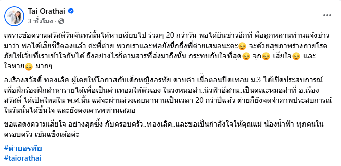 สูญเสียตลอดกาล “ต่าย อรทัย” โพสต์เศร้า ถึงบุคคลสำคัญในชีวิต ผู้เคยมอบโอกาสให้เธอ ไม่มีอีกแล้วข้อความสวัสดีวันจันทร์