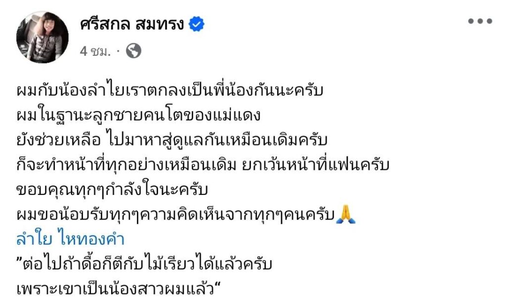 เริ่มที่ประเด็นร้อนดราม่าความรักของ “ลำไย ไหทองคำ” ที่ดูเหมือนว่าจะจบลงไปแล้ว ล่าสุดทางด้าน “ปุ้ย L.กฮ.” ได้ออกมาเผยสถานะกับ “ลำไย” โดยโพสต์ข้อความว่า “ผมกับน้องลำไยเราตกลงเป็นพี่น้องกันนะครับผมในฐานะลูกชายคนโตของแม่แดง ยังช่วยเหลือ ไปมาหาสู่ดูแลกันเหมือนเดิมครับ ก็จะทำหน้าที่ทุกอย่างเหมือนเดิม ยกเว้นหน้าที่แฟนครับ ขอบคุณทุกๆกำลังใจนะครับ ผมขอน้อบรับทุกๆความคิดเห็นจากทุกๆคนครับ ลำใย ไหทองคำ “ต่อไปถ้าดื้อก็ตีกับไม้เรียวได้แล้วครับ เพราะเขาเป็นน้องสาวผมแล้ว”